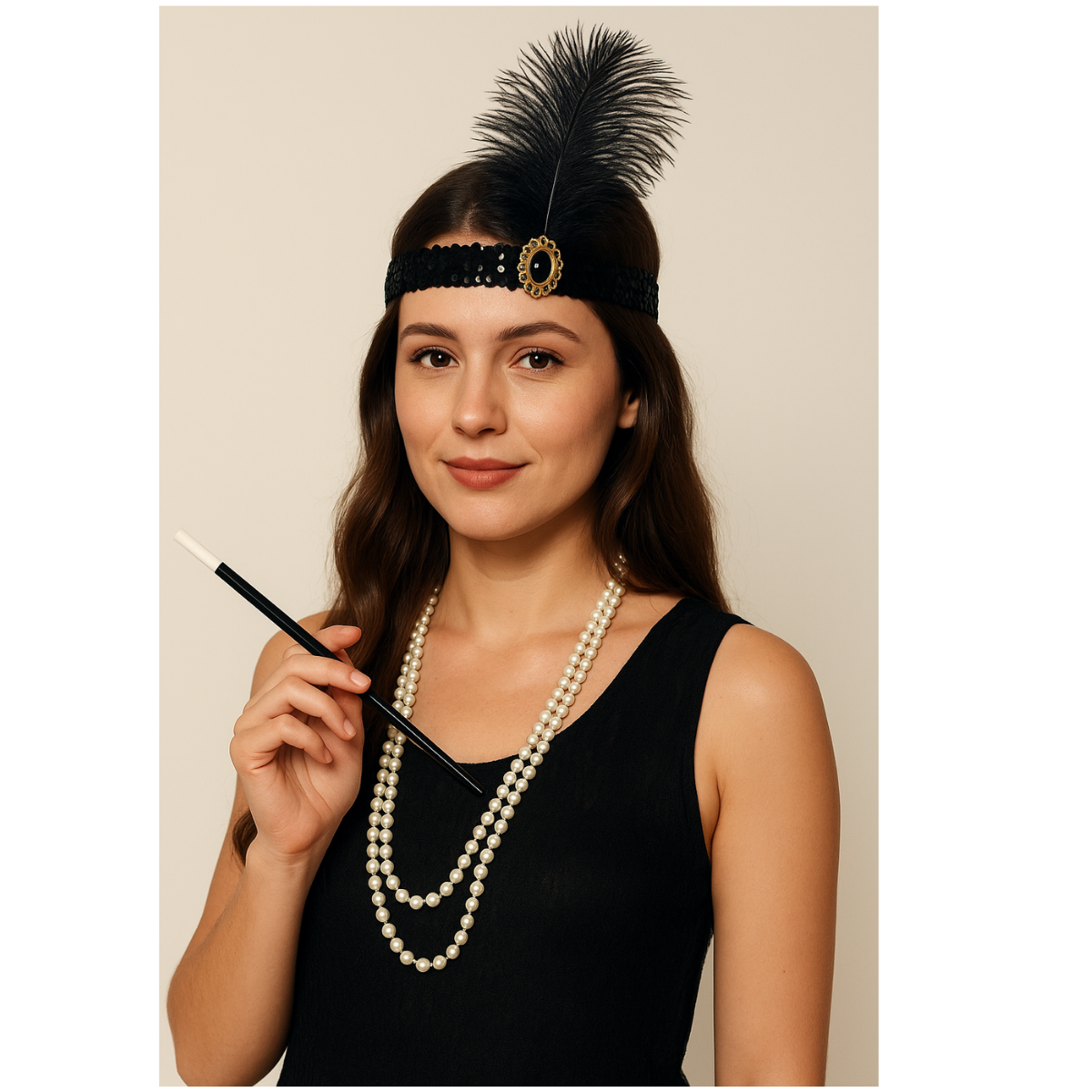 Esse kit é encantador, perfeito para quem deseja brilhar e dançar em qualquer festa temática. Composta por 100% poliéster, lantejoulas e penas, oferece conforto e um visual deslumbrante.